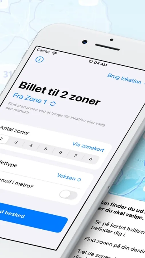 Hvis du ønsker finder vi automatisk din lokation og nærmeste station, hvorefter du blot vælger det antal zoner du skal rejse i. Hvis du er i tvivl, kan Zonekortet hjælpe dig på vej.