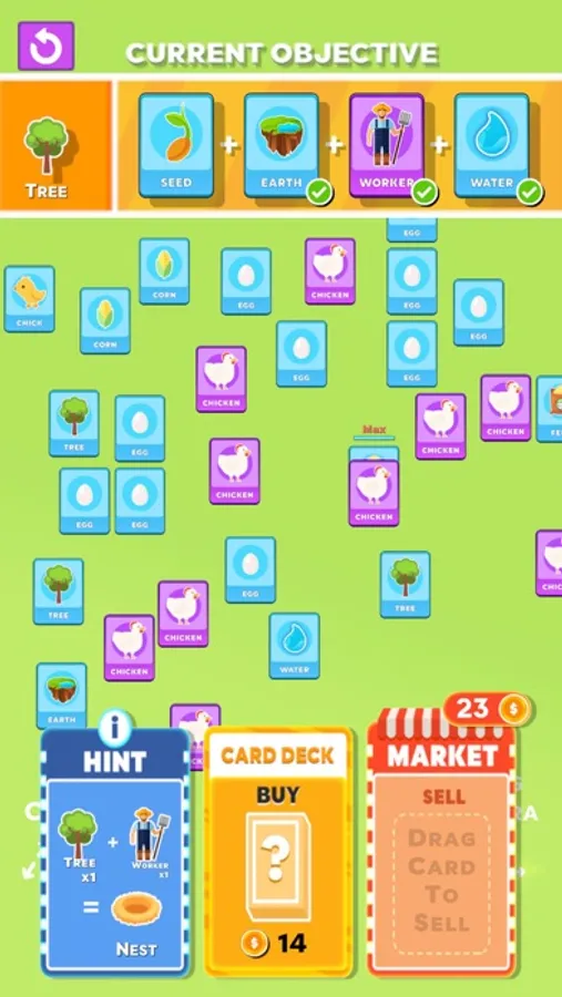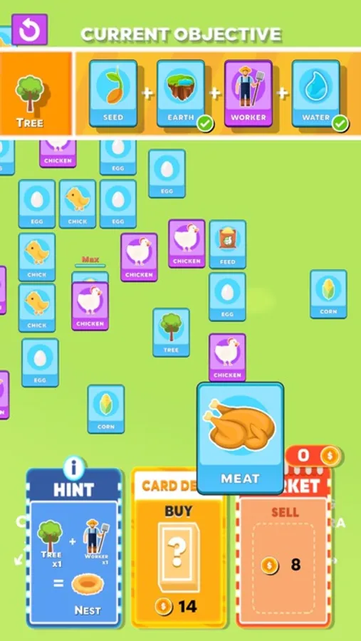 You can try different combinations of cards to produce higher value chickens and sell them for money. The more money you earn, the more cards you can unlock, and the bigger your farm can be grown. You can use the money earned to expand your farm, purchase upgrades and new equipment, and unlock new stacks of cards to discover new chicken breeds and earn more money.