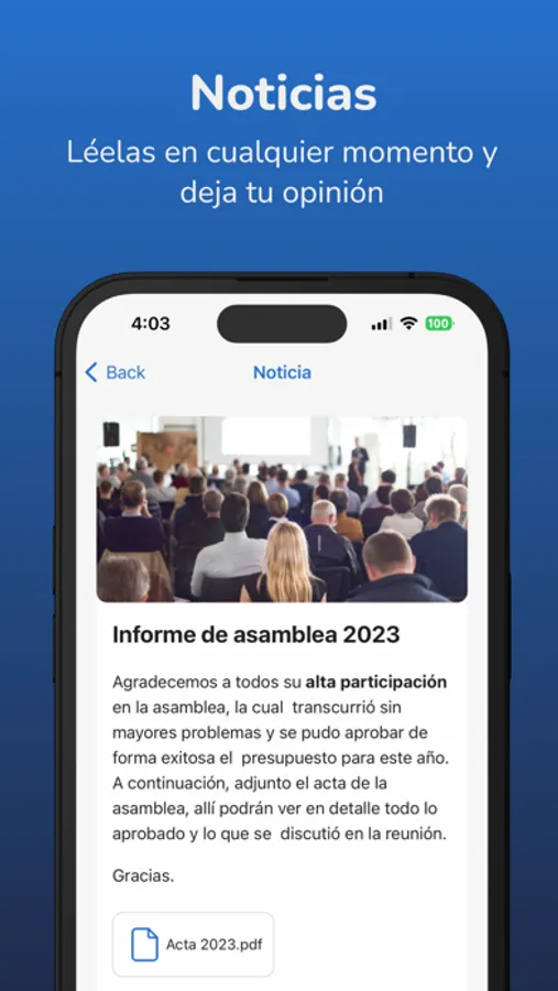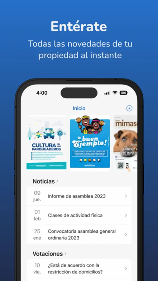* Noticias y comunicados: mantente enterado y opina sobre las novedades, circulares e información relevante de la administración para sus copropietarios y habitantes.