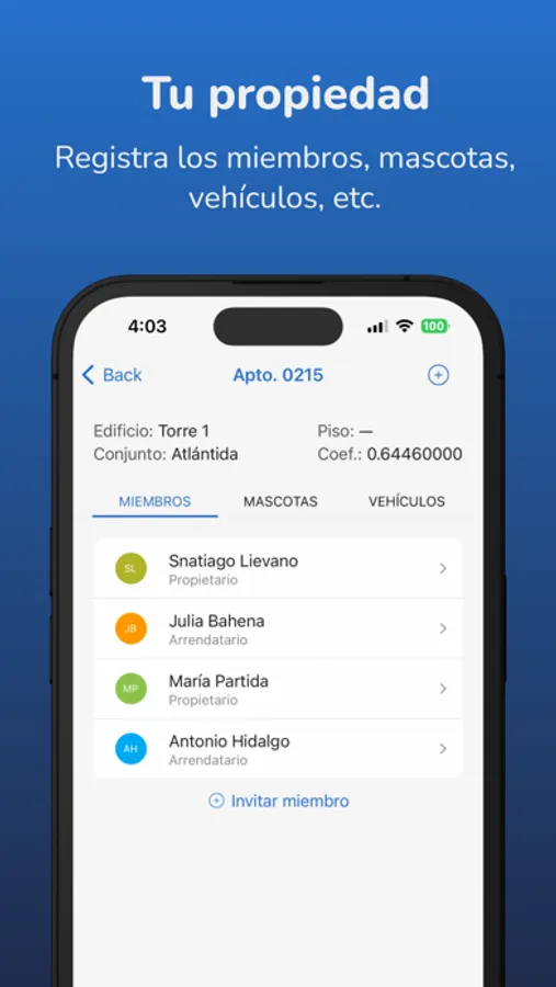 * Registros de tu propiedad: registra tus mascotas, vehículos, miembros de tu familia, para una mejor gestión de la administración.