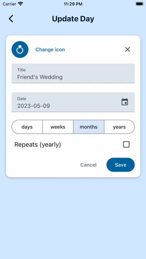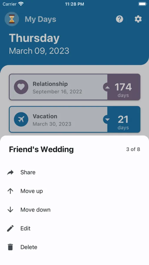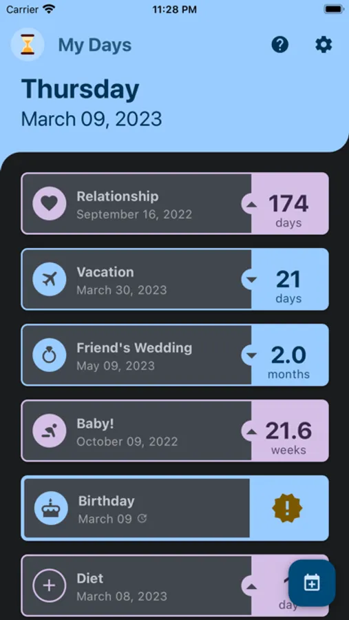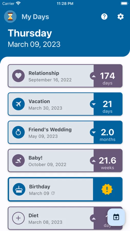 "My Days" is intended to provide a quick overview of the time until/from important events. Never forget when the next important day is with "My Days"!