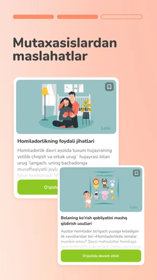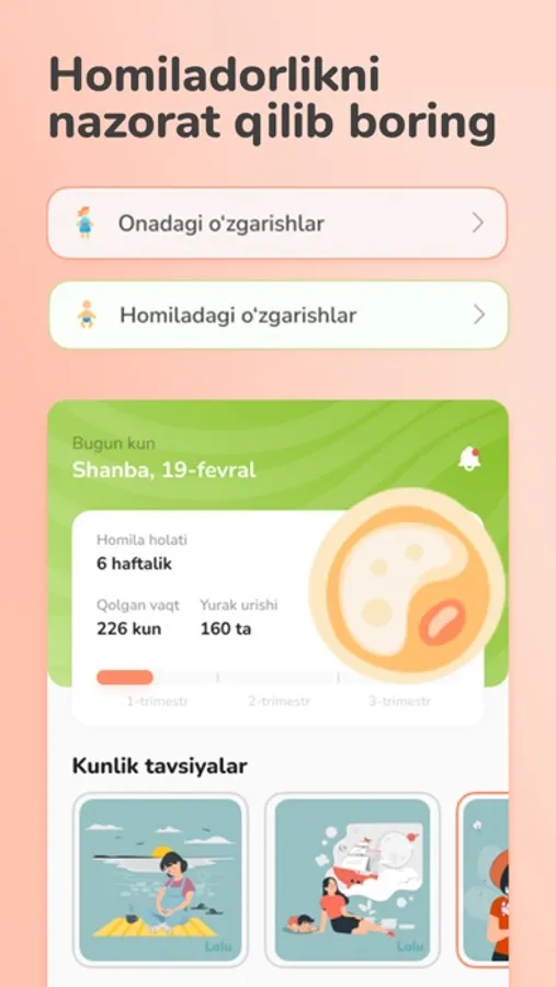 Xo‘sh, biz bilan takrorlanmas hissiyotlarga sho‘ng‘ishga tayyormisiz, unda hoziroq ilovani homiladorlik taqvimi bilan birgalikda yuklab oling. Hamda sog‘lom farzand dunyoga keltirish, uni parvarishlash singari masʼuliyatli vazifani Laluʼda olgan bilimlaringizga tayangan holda osonroq ado eting.