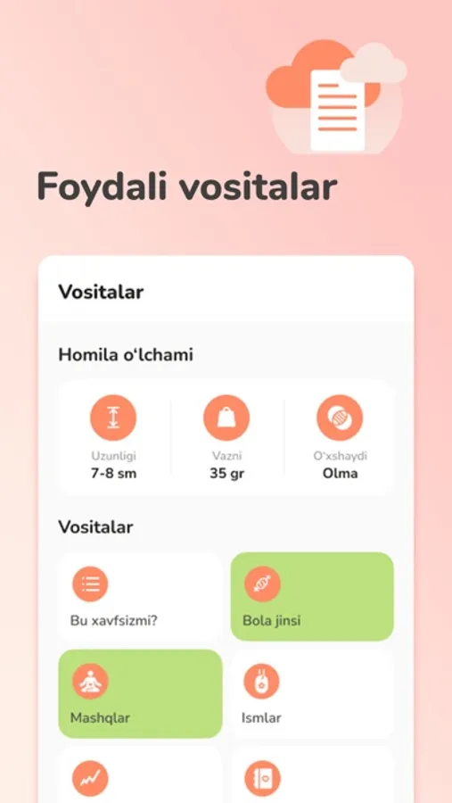 Homiladorlik kalendari - 42 hafta davomida homilangizdagi va sizdagi o‘zgarishlar, homiladorlikda to‘g‘ri ovqatlanish, ginekolog maslahatlari, muddatingizga mos ravishda tavsiya qilingan tibbiy tekshiruv rejalari haqida maʼlumotlar;
