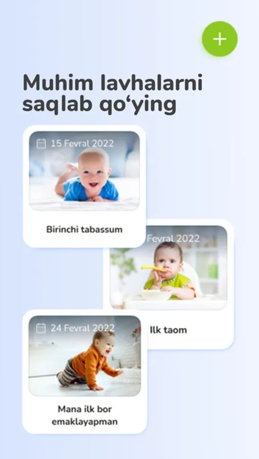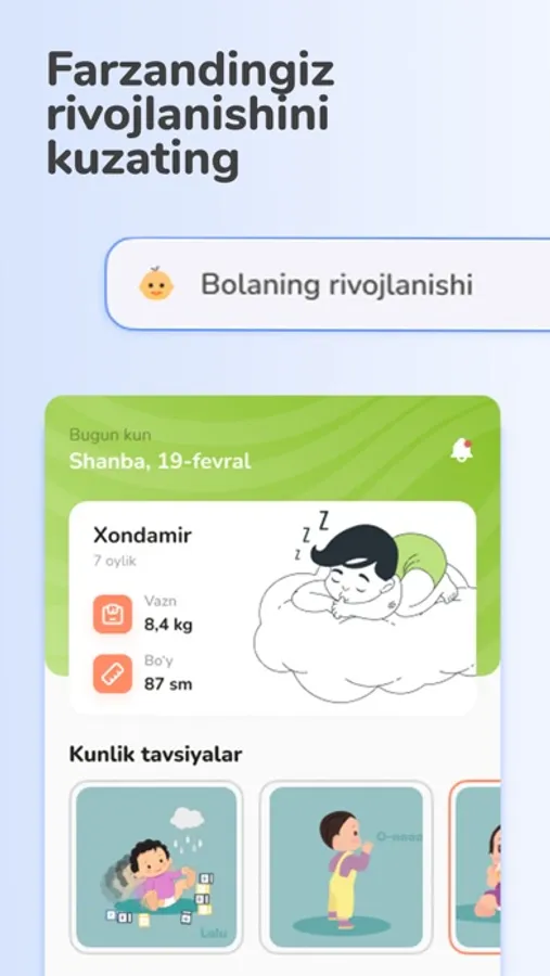 Bola rivojlanishi kalendari - Chaqaloqning chilla davri va uning bir oylikdan bir yoshigacha bo‘lgan rivojlanishi bayon qilingan foydali taqvim. Kalendar orqali bola ovqatlanishi, uyqusi, psixologiyasi, qobiliyatlari va boshqa ko‘plab o‘zgarishlarini oyma-oy kuzatib borish imkoniyati;