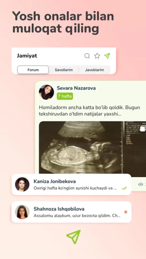 Lalu hamjamiyati - Boshqa homilador ayollar va yosh onalar bilan fikr va tajriba almashish uchun ilovamizdan foydalaning.
