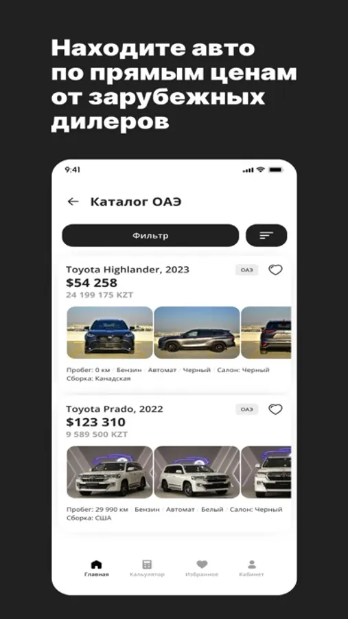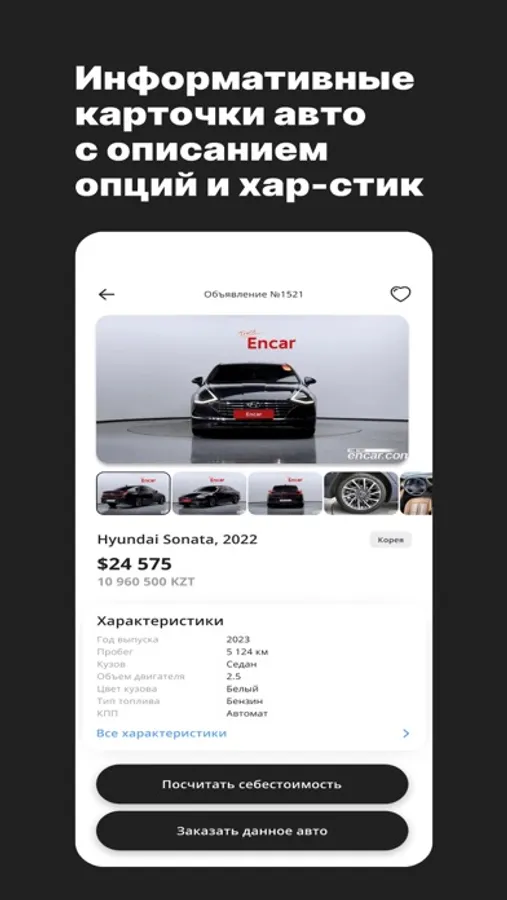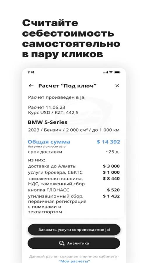 Jai is a platform that contains many services for importing cars from abroad to Kazakhstan. In the application, you can easily calculate the cost of the car, which includes customs clearance, delivery, initial registration, recycling fee and payments for a technical passport with license plates. The application also integrates catalogs with more than 40 thousand cars from various countries, such as Korea and the UAE, in a convenient format. Find the car you need and easily calculate its cost price inside our Jai application. In the near future, other catalogs of cars from China, USA, Germany, Canada, Armenia and Georgia will be connected. In addition, we provide consulting and accompanying services for customs clearance of cars, logistics and other processes related to the import of cars to Kazakhstan from abroad. With Jai, you can be sure that you will find the right car at a great price, make a full calculation of all expenses, and receive a high-quality turnkey service from Jai and its partners.