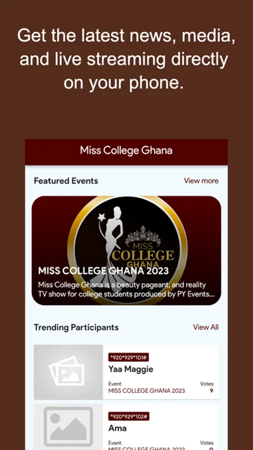Vote for your favourite contestant in Miss College Ghana, a beauty pageant, and reality TV show for college students produced by PY Events Ghana. Get the latest news, media, and live streaming directly on your phone.