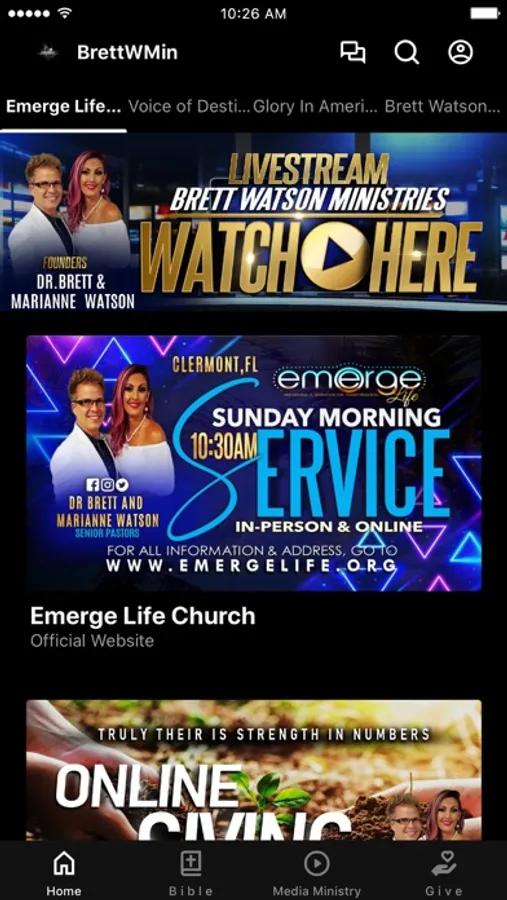 All of the divisions of Brett Watson Ministries can easily be accessed here on our App - From News and Events, Live Stream TV and Church Services, Online Giving, Biblical Teachings, Scripture and Daily Encouragement, Our App makes it easy to be a part of all that God is doing and to assist you in Your Destiny Pursuit!