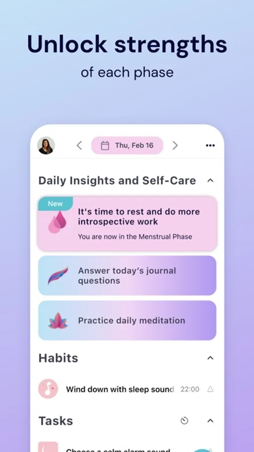 Essence is much more than a period tracker - it helps you unlock the hidden superpowers of each cycle phase to work with your periods, not against them. Intelligent task planner helps women* stay organized and focused and most importantly take care of themselves during the cycle. By taking into account the changes in your energy levels and mood swings, the app recommends the best time for performing certain tasks, gives daily insights on workouts and nutrition.