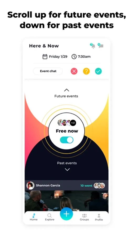 Our platform is designed to help you connect with real people and communities around you, in person, and in real-time. With our unique feed, event planning tools, explore feature, and Free Now function, you can easily connect with real-world events and communities that align with your interests, helping you to discover new passions and connect with like-minded people.