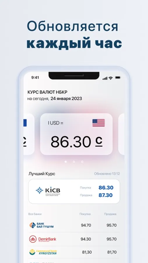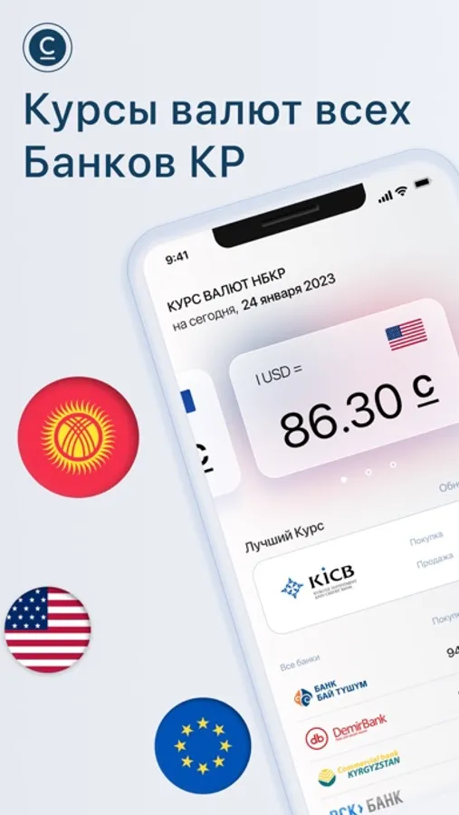 В приложении собрана информация об основных валютах в Кыргызстане, среди которых доллар, евро, рубль, тенге. Программа постоянно обновляет курс Национального Банка КР, всех банков и выполняет пересчет, отталкиваясь от новых данных.