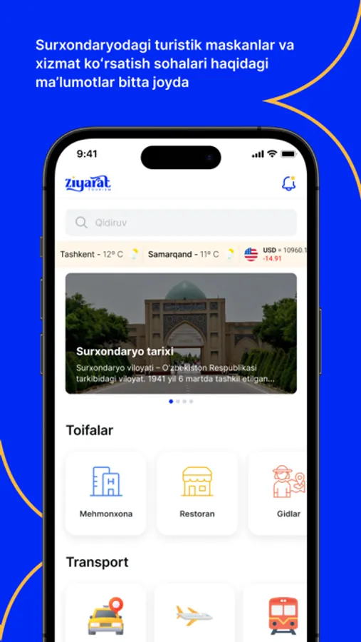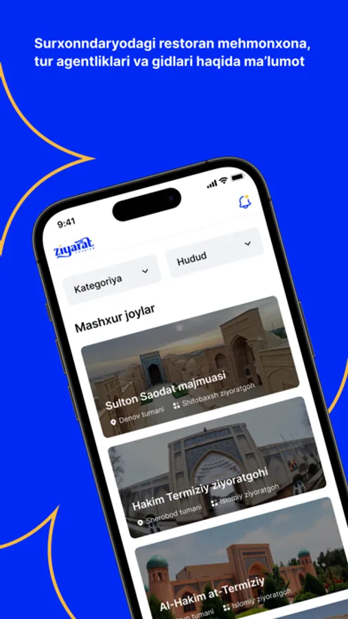 Yurtimiz ziyorat turizm salohiyatini to'liq yoritib berish; mahalliy va xorijiy sayyohlar hamda aholini foydali ma'lumotlar bilan ta'minlash. Hozircha faqat Surxondaryo viloyatidagi maskanlar haqida ma'lumotlar mavjud. Ilova vaqt o'tishi bilan hududlar qamrovini va ma'lumotlar ko'lamini kengaytirib boradi. Hozircha yo'q, yaqin kelajakda savdo xizmatlari hamkorligi yo'lga qo'yilib ilovaga bu imkoniyat ham qo'shilishi rejalashtirilgan. Ilova O'zbek, rus va ingliz tillarida.