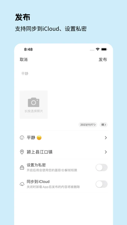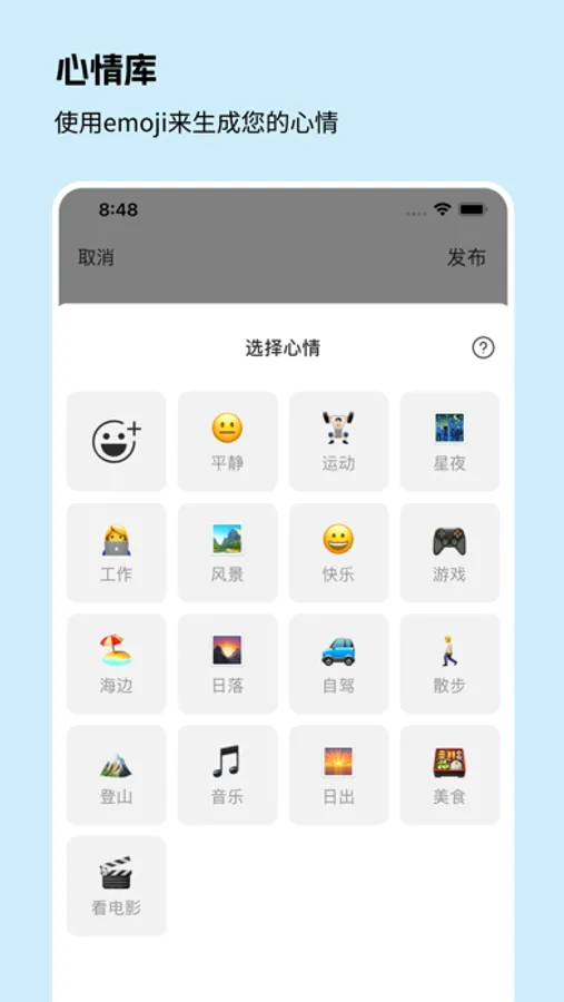 心情统计:将发布的记录按”心情“统计起来,各“心情”记录情况一目了然。