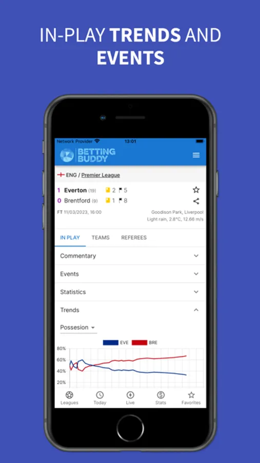 The rich statistics data include fixtures, teams, players and referees statistics, live features like match commentary, events and trends, H2H data.