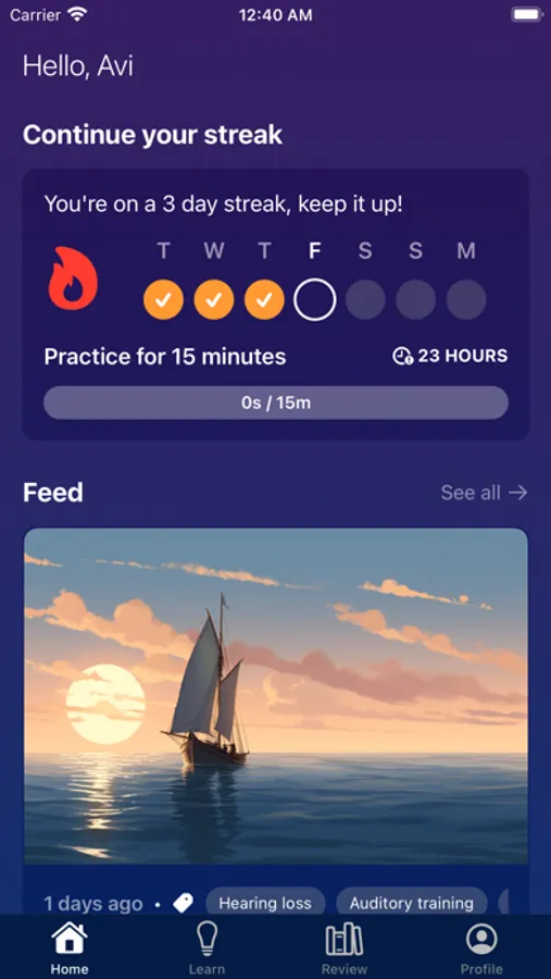 Our user-friendly interface, dynamic content, and personalized approach make Auribus the ideal companion for your auditory training journey. Track your progress, celebrate your achievements, and enjoy regular content updates tailored to your individual needs. The streak concept is designed to motivate you and keep you accountable in your auditory training journey.