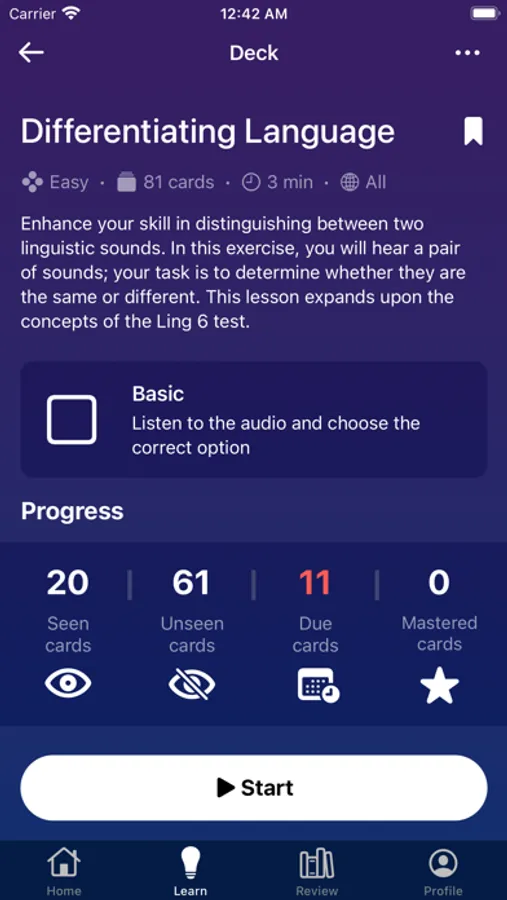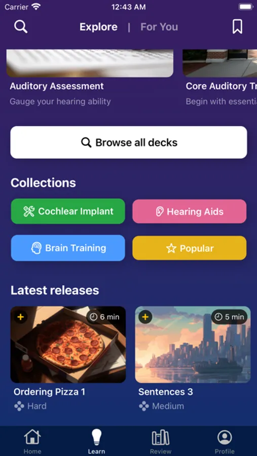 Auribus provides a range of modules to help you develop essential listening skills. Spanning from the identification of fundamental sounds to comprehension of intricate sentences and managing real-world scenarios, our app encompasses all facets of auditory growth. It also includes an expanded version of the notable Ling 6 Sound Test, assuring you the optimum utilization and effectiveness of your hearing device. The app employs a spaced repetition approach, intelligently adapting to your performance and focusing on the areas where you need the most improvement.