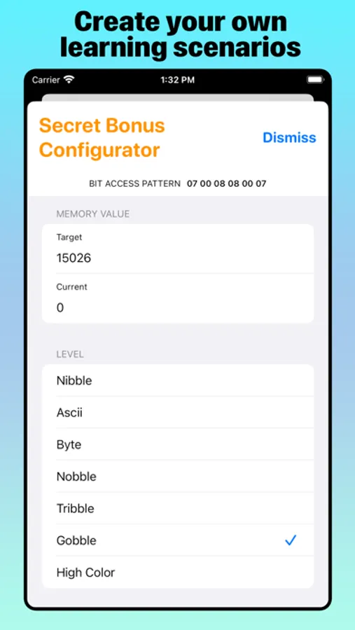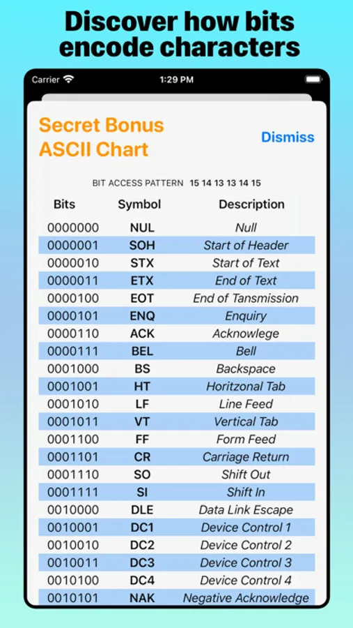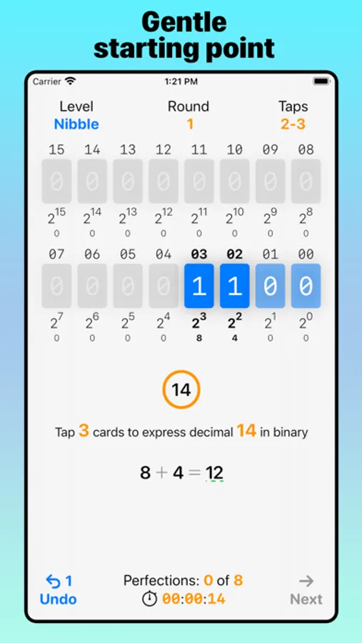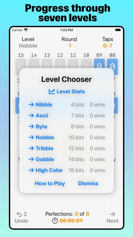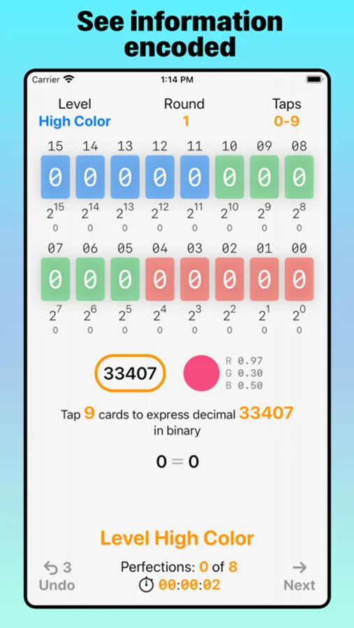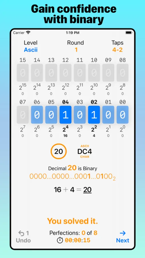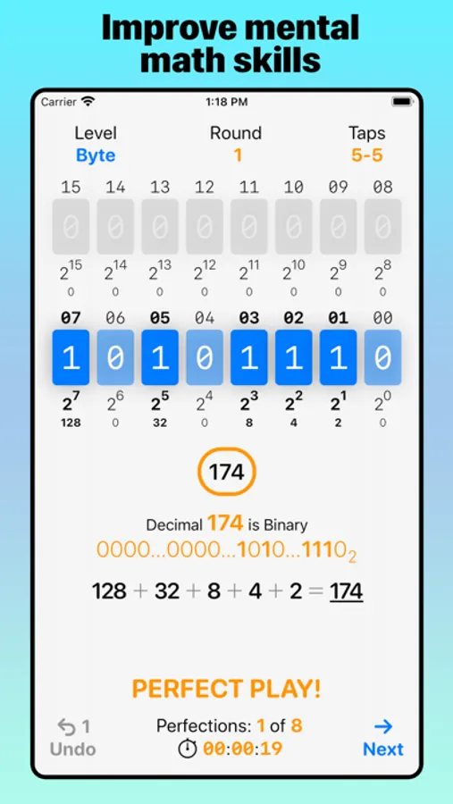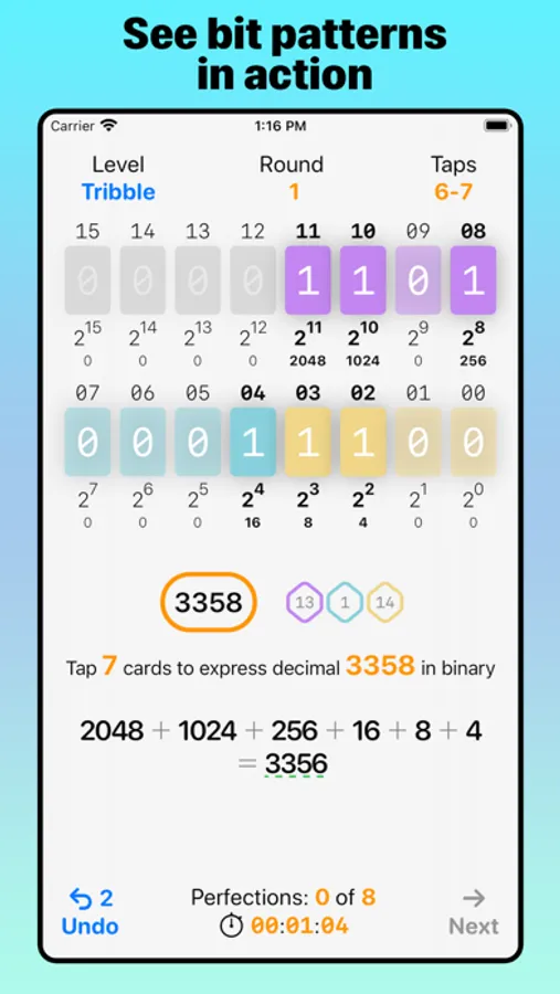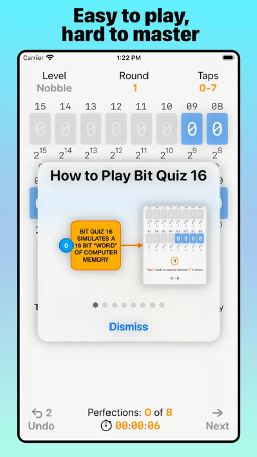 Whether you’re a learner or a professional programer, Bit Quiz 16's clean design, progressive levels, and interactive simulation of computer memory lets you learn hands-on the properties and patterns of binary arithmetic by tapping bits. Another benefit of playing through each level of Bit Quiz 16 is mastering addition, subtraction, and regrouping of numbers in your head with progressively larger amounts.