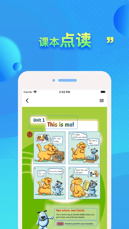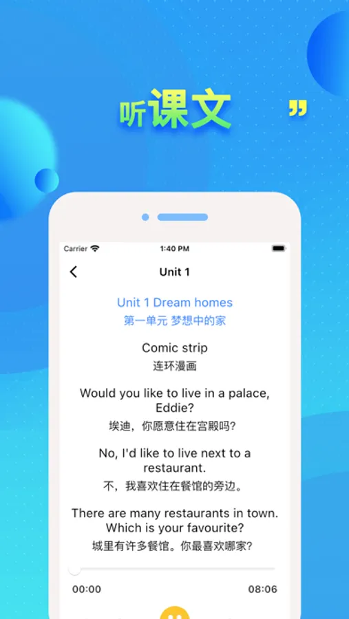 同步课本各单元听力,音频。与单纯音频播放不同,增加语速调整,中英文对照,播放进度控制声音播放与文本同步。
