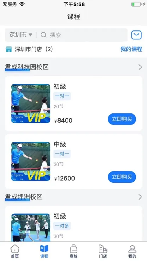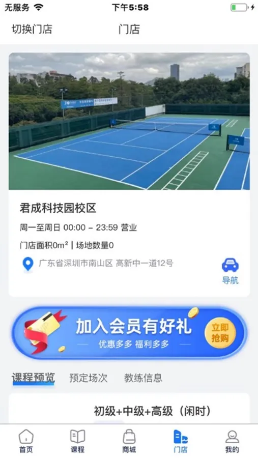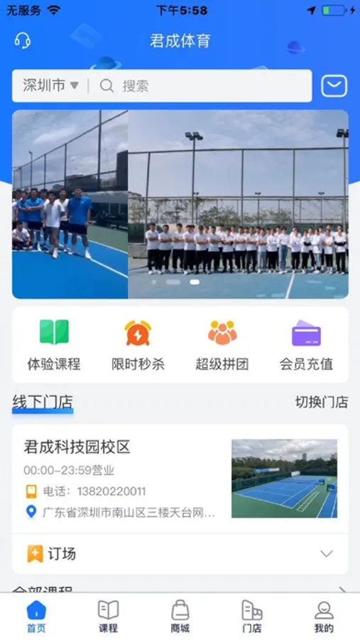君成体育是由深圳市君成仁合科技服务咨询有限公司推出的,针对于网球场馆日常运营、网球培训、网球装备及各类活动赛事开发的线上平台,主要有线上预定网球场地、购买网球装备、查看网球门店信息等内容,成员可以在手机上查看附近网球门店信息,预约门店教练。