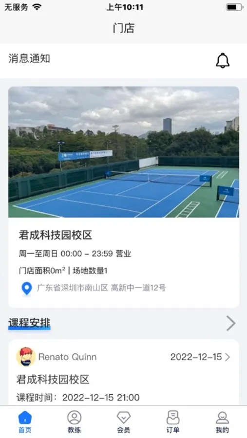 君成管理是由深圳市君成仁合科技服务咨询有限公司推出的,针对网球门店运营的内容平台,用于网球门店店长对门店信息的管理。可以查看门店课程信息、教练信息、网球装备信息,还可以及时查看门店课程的预约情况,维护门店学员信息。