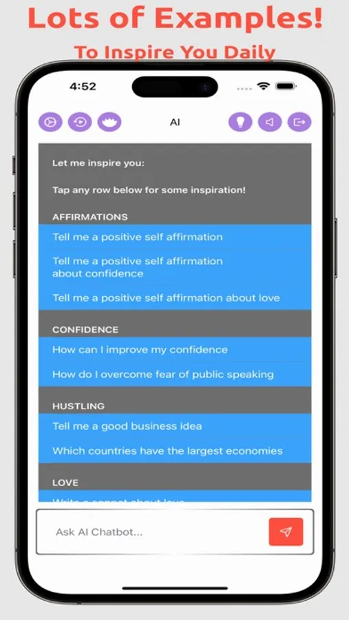 Chat With our inspiring AI ChatBot whenever you want. AI Bot always available on your Phone or iPad to inspire you daily. Your questions answered in seconds.
