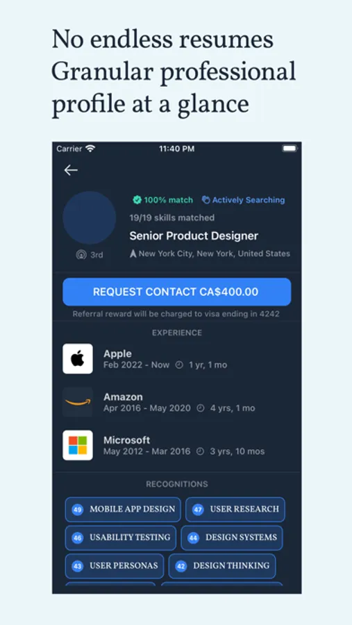 Job seekers, Reputed is your reliable sidekick. We're not here to just land you any job. Our mission is to unearth the perfect match for your skills and aspirations so that you can reach your maximum potential. Use your peers to showcase your reputation - have your skills and experiences validated by those who know you and your work firsthand. This gives you a genuine advantage when it comes to capturing the attention of top employers. You won't be sifting through irrelevant spam messages from recruiters. With Reputed, you'll enjoy a curated, noise-free environment with the sole focus of matching your qualifications to the right opportunities. And most importantly, you're always in control of your information and who has access to it.