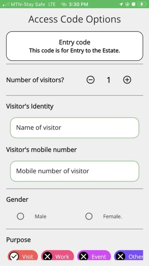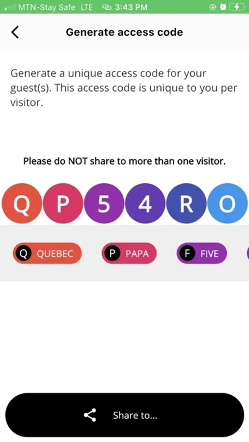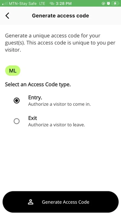 Sentry allows residents to generate an access code for each of their visitors. This code is validated at the security gate to let the visitor in or out.
