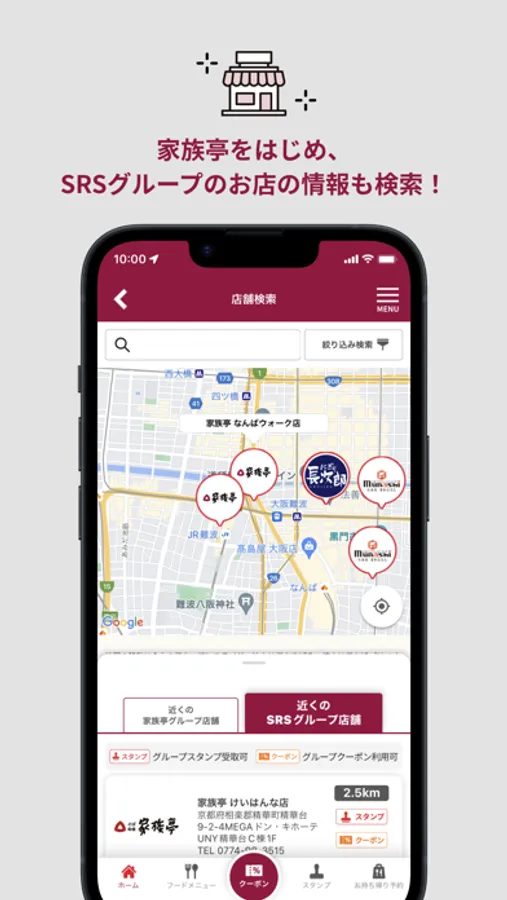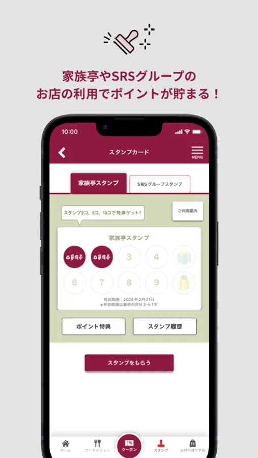 家族亭グループのお店やSRSグループ(和食さと・長次郎・宮本むなし・天丼・天ぷら本舗さん天)でスタンプが受け取れます。