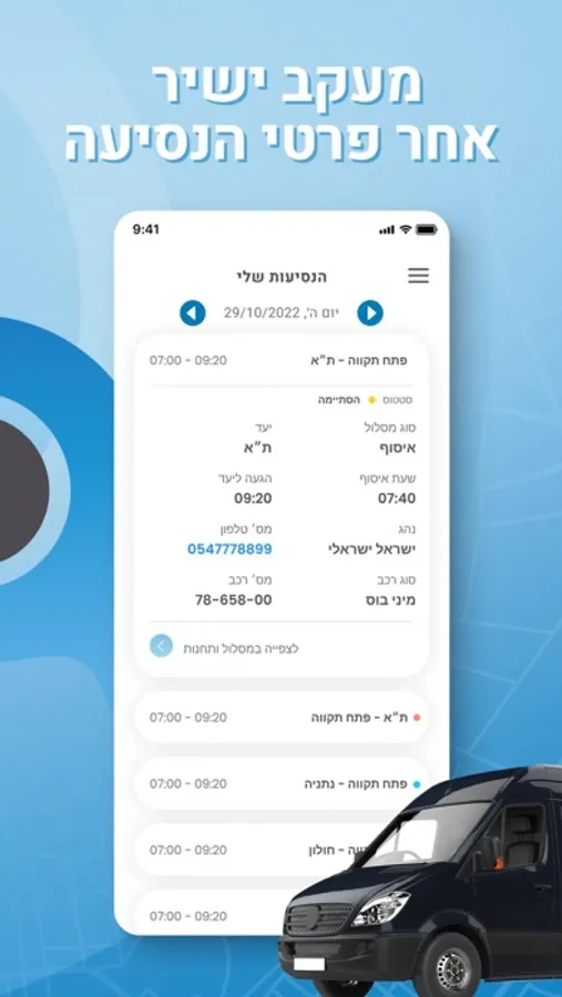 האפליקציה מחברת בין הנוסעים לנהג בצורה נוחה וידידותית, ומאפשרת לכל נוסע לדעת מה שעת האיסוף שלו בזמן אמת.