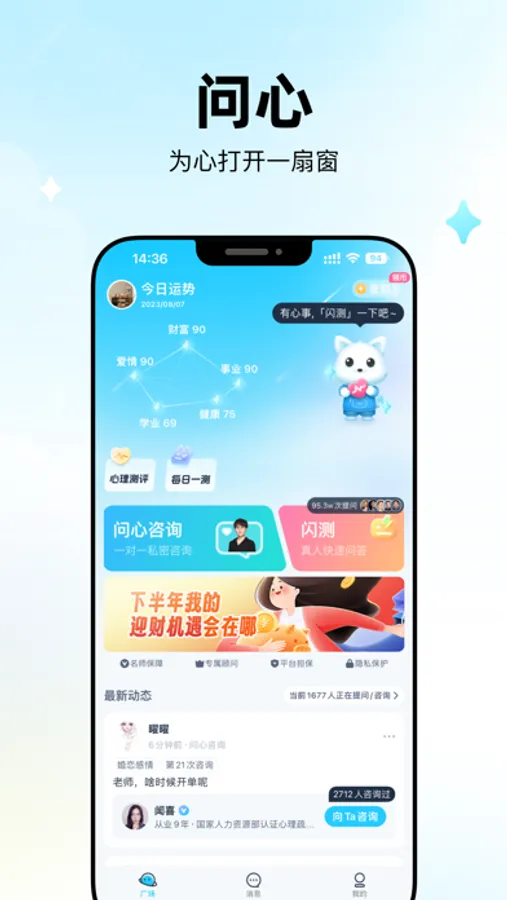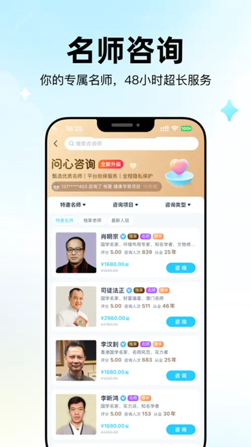 1、名师保障:平均15年以上经验的运势和身心灵老师,已为100万+用户解决了算命、占卜、八字、星座、塔罗、运势、心理咨询、情感事业、婚姻家庭等问题。