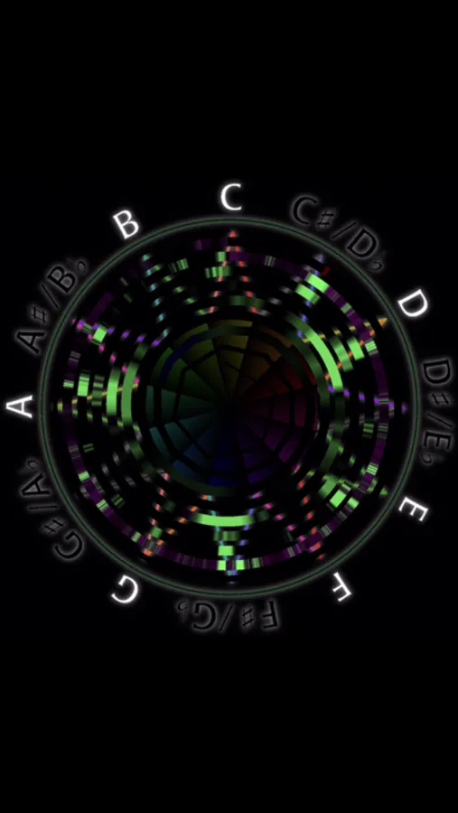 It listens to the microphone on your device, in real time, and converts the audio data to frequencies - an audio spectrogram (also known as FFT - fast Fourier transform). The difference compared to a typical audio spectrogram is the way frequencies are displayed - mapped on a spiral type graph - conceived to indicate the frequencies of the musical notes (C, C#, D, D#, E, F, F#, G, G#, A, A#, B).
