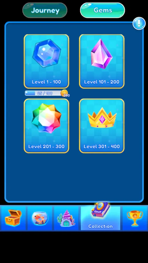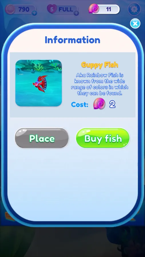 The player's objective is to swap adjacent objects to create a row of three objects, which will cause them to disappear from the board. Each time the player successfully matches a group of objects, they earn points and new objects will fall down to fill the gap. Users use rewards to collect colorful and cute fish.