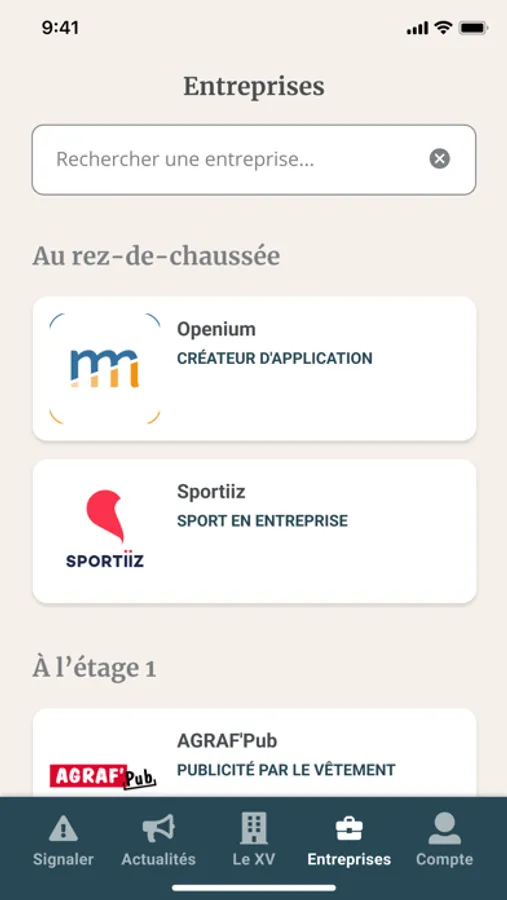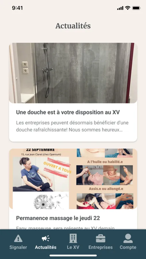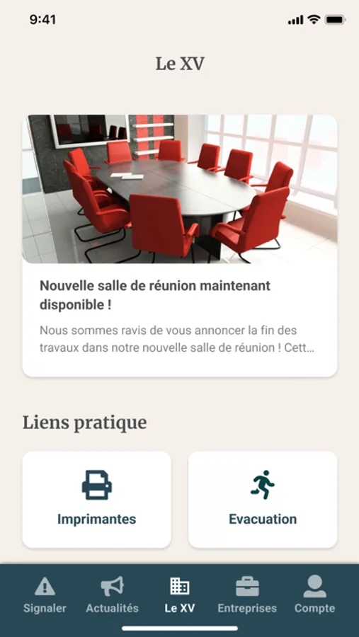 Sur l’application gratuite Le XV, vous retrouverez la liste complète des entreprises installées dans le bâtiment, ainsi que tout un tas d’infos pratiques. Vous êtes locataire au XV ? Retrouvez toutes les actualités du bâtiment, des informations sur le fonctionnement des outils communs (imprimante, défibrillateur, bornes de recharges pour véhicules électriques et hybrides). L’app vous permet également de réserver une salle de réunion en quelques clics et de signaler une anomalie, un accident, ou tout autre problème que vous pourriez rencontrer.