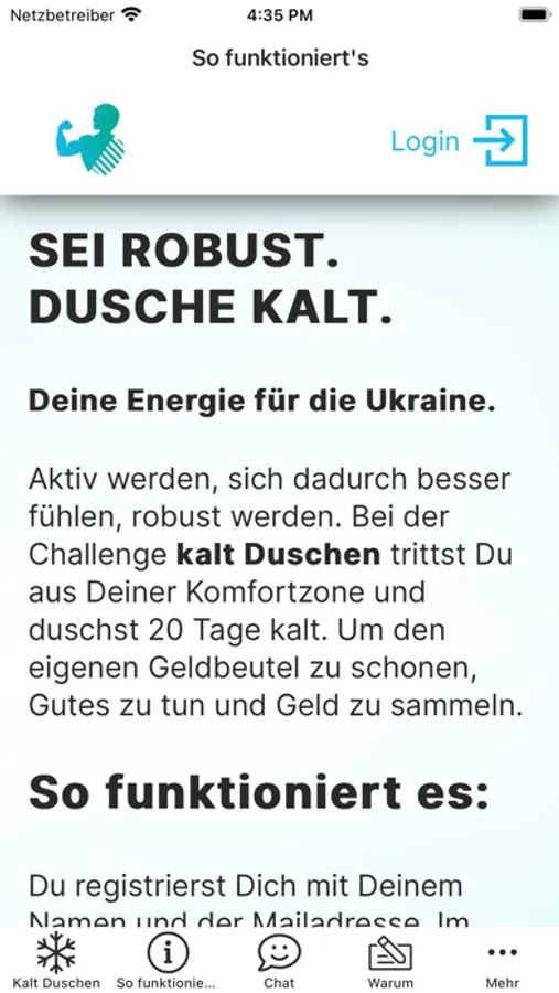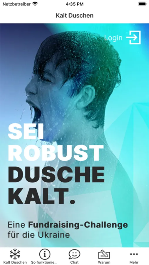 Für diese Challenge könnt Ihr Euch zu Teams zusammenschließen. Über einen Zeitraum von 3 Wochen werden alle Duscheinheiten gezählt, bei denen man mindestens eine Minute lang kalt duscht. Ein Dashboard zeigt jederzeit den aktuellen Gruppenstand. Das eingesparte Geld könnt Ihr am Ende der Ukraine-Direkthilfe zugutekommen lassen.
