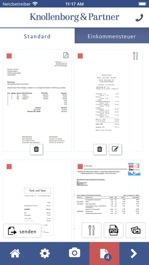 Machen Sie einfach ein oder mehrere Fotos von Ihren Belegen und versenden Sie diese mit einem Klick direkt aus der App heraus an Knollenborg & Partner.