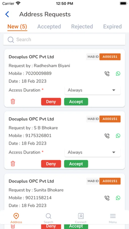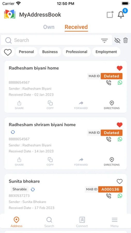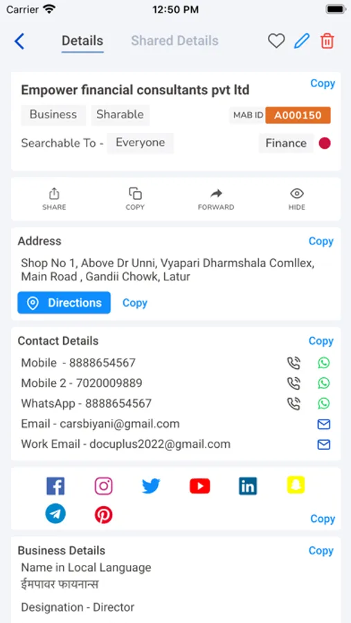 Easy address share facility with Selected details via Whatsapp/SMS/ email