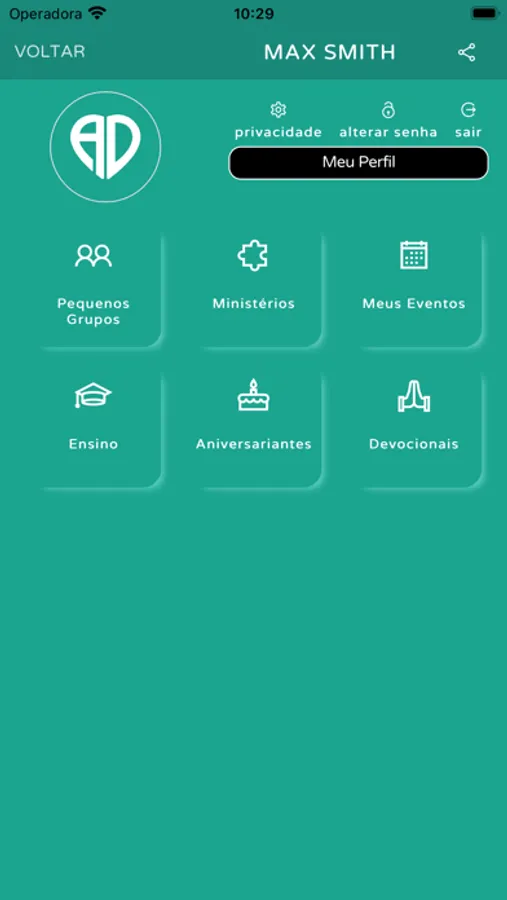 * No item Meu Perfil é possível atualizar seus dados cadastrais na Igreja;