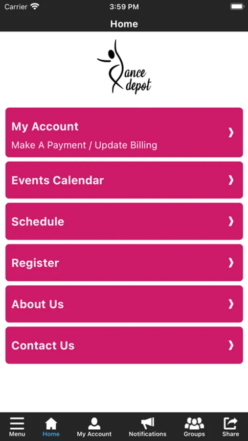 The Dance Depot app allows you to manage your account with ease, register for classes, parties, and special events. You'll also receive important notifications about class changes, closings, registration openings, special announcements, and upcoming events.