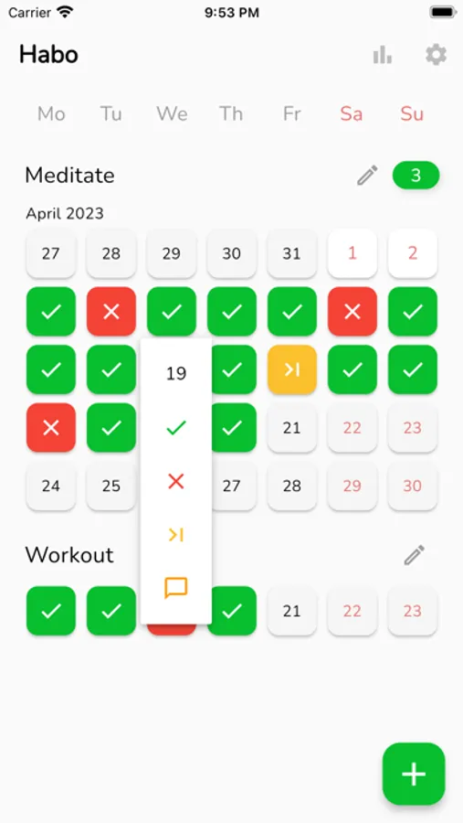 With Habo, you can customize your own habit list, set reminders, and add notes to help you stay motivated. Whether you're looking to improve your exercise routine, eat healthier, or simply adopt better habits, Habo is here to help you succeed.