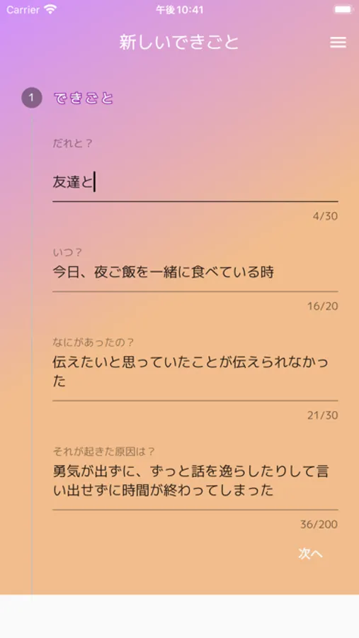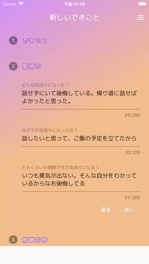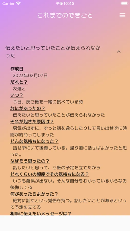 日々生きていく中で起きる「できごと」を言葉にすることで、向き合うことができる自己内省アプリです。質問項目に沿って思いついたことをメモしていってください。そのメモしたことについて内省をして、深めていくとより良いでしょう。