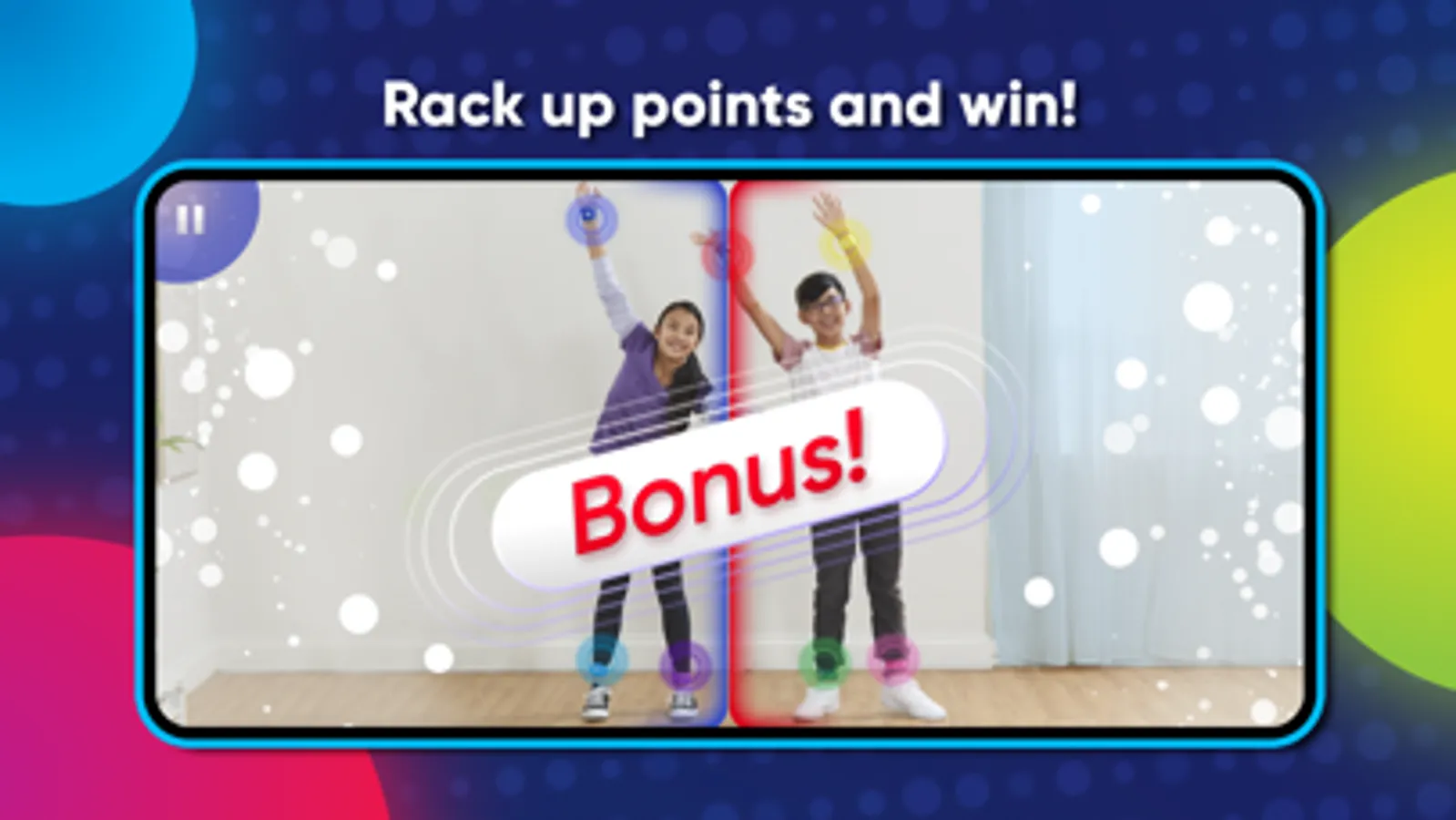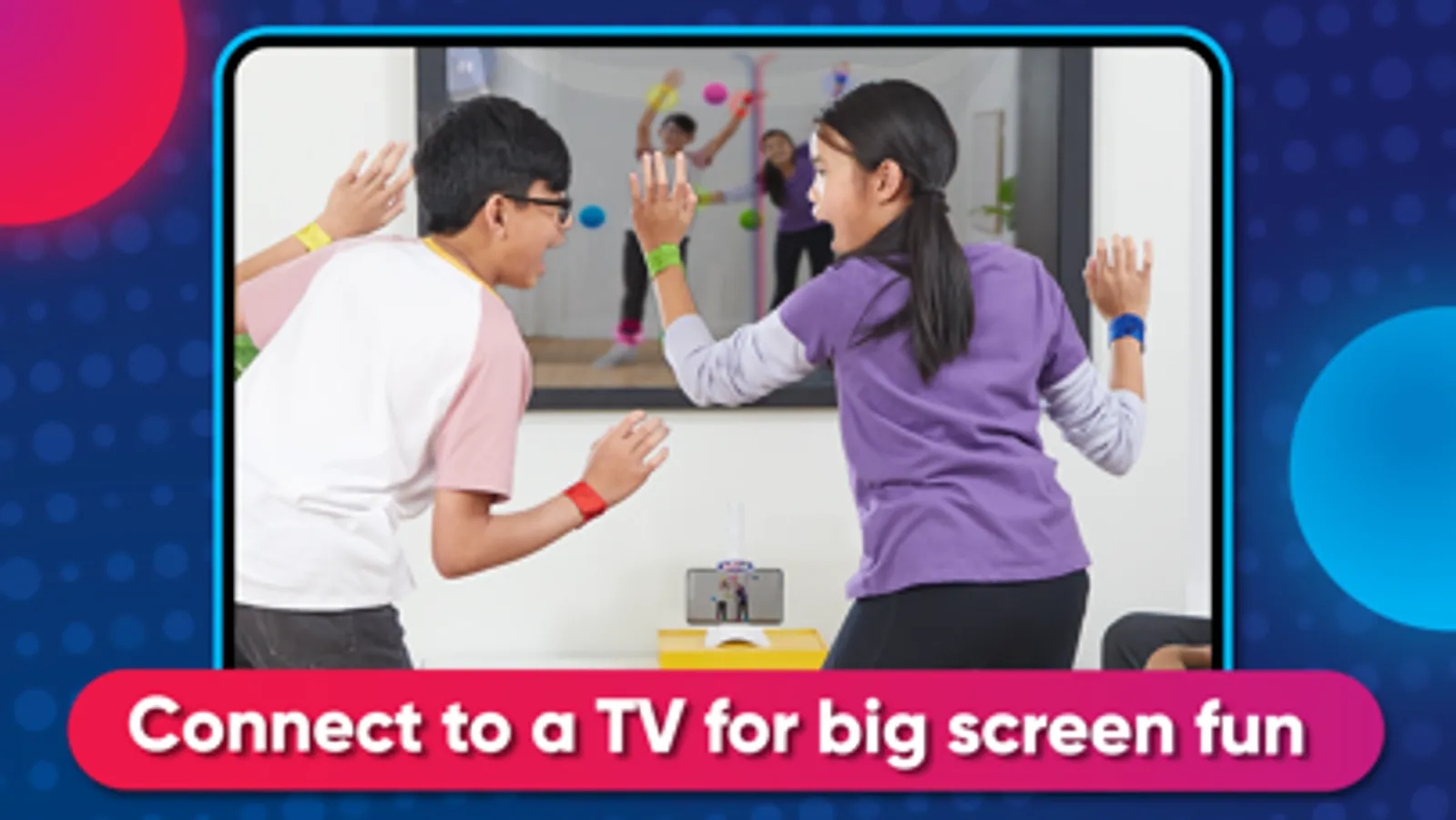 MATCH BANDS TO SPOTS ON SCREEN: Players reach, clap, swipe, and pose to the beat as they scramble to match their wrist and ankle bands to the colored spots on screen.