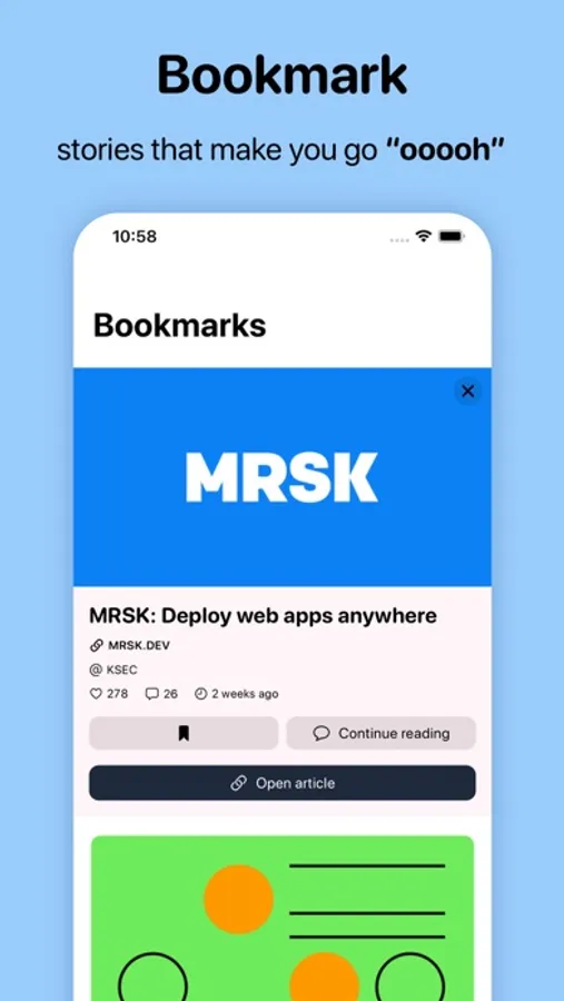 Save and sync your favorite stories across all your devices. With iCloud integration, you can access your bookmarks from anywhere and pick up where you left off.