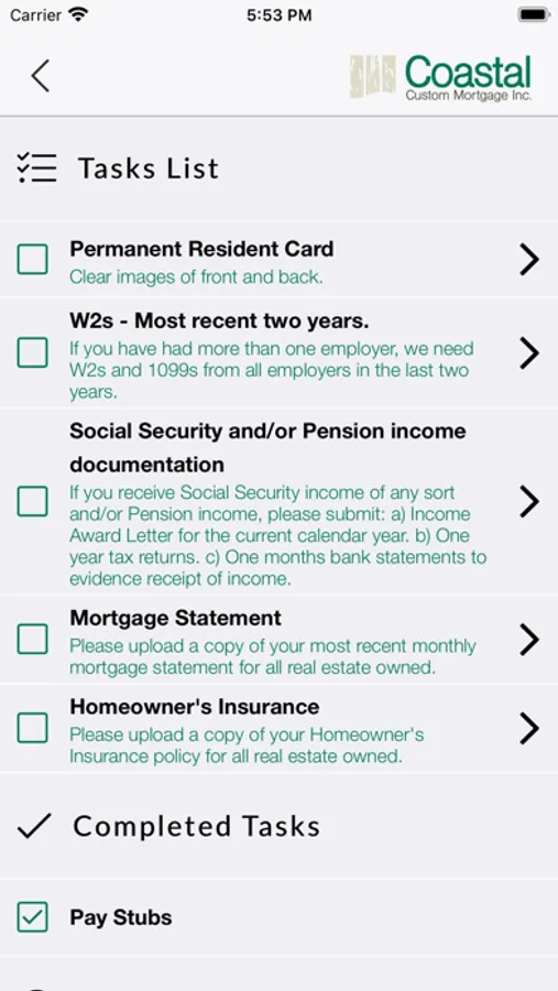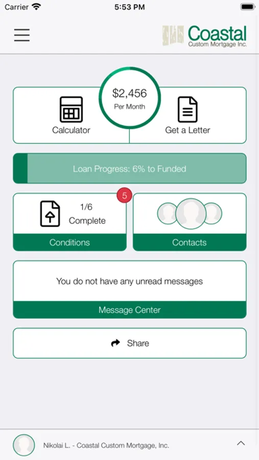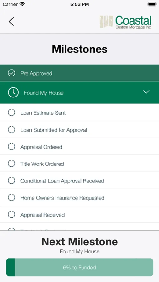 The Coastal Custom Mortgage app allows all 3 parties (home buyer, loan officer, real estate agent) to track the progress of the home loan application process as the Home Buyer meets the milestones and conditions required to get final approval.
