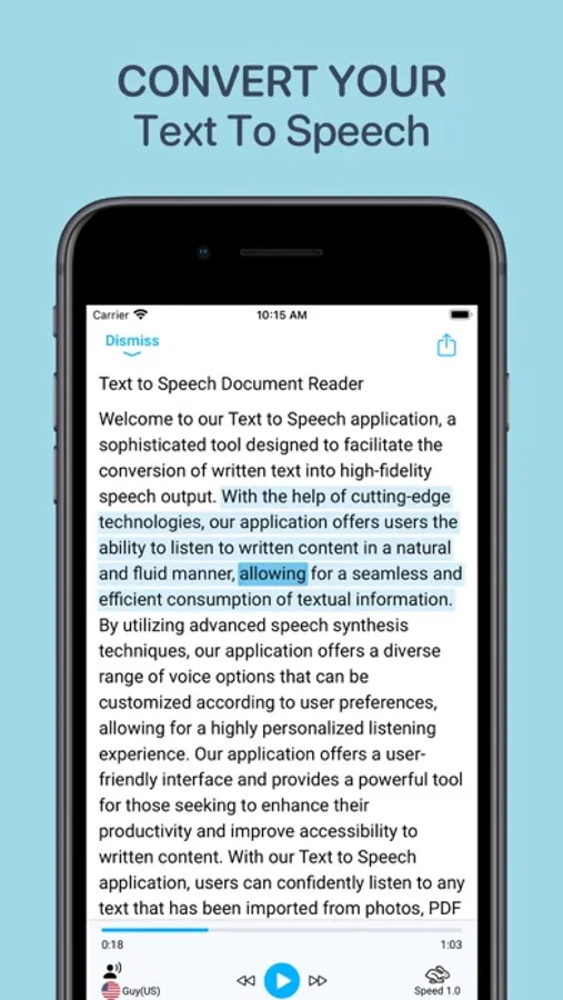 Text To Speech Document Reader is an essential tool for all types of readers, especially those who are busy or have dyslexia or other reading difficulties. The app can also help users read faster and remember longer, as it highlights each word and sentence as it reads.