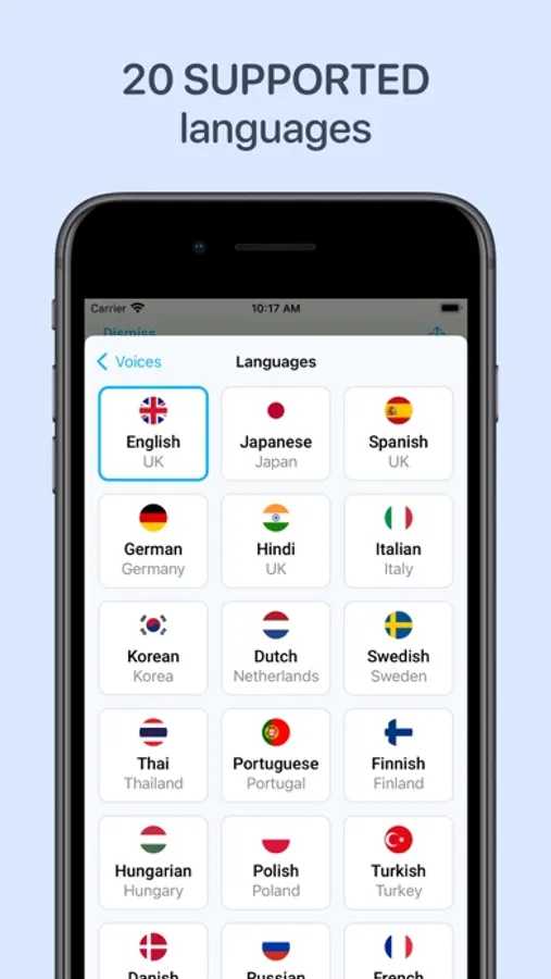 • Support multiple languages: English, Spanish, German, French, Portuguese, Japanese, Italian, Russian, Dutch, Finnish, Swedish, Danish, Turkish, Polish, Hungarian, Vietnamese, Arabic, Hindi, Korean, Thai with more than 50 high-quality voices.
