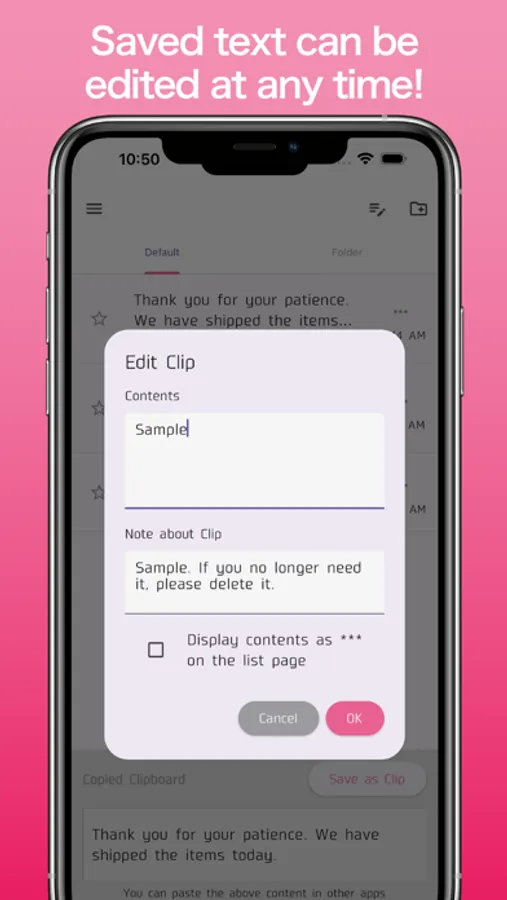 The contents being copied to the clipboard can be saved as-is in the app (saved contents are referred to as "clips" below).
