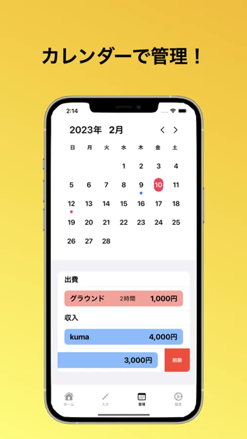 ・出費、収入のリストはスライドさせて消すことができます。