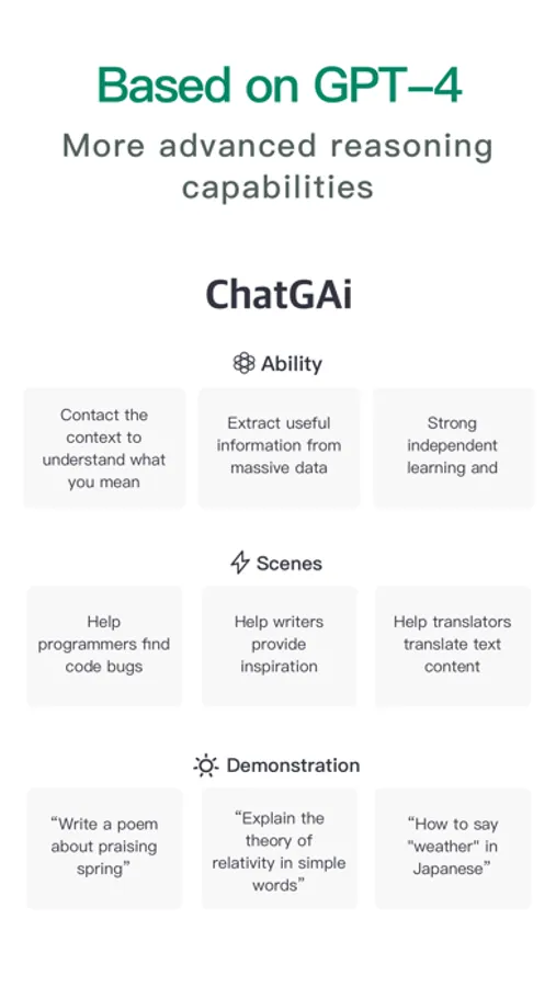 ChatGAi is an all-in-one application that integrates the most advanced artificial intelligence technology, dedicated to meeting all your needs in work and life. With outstanding AI chat, AI creation and AI personal assistant functions, ChatGAi mimics human conversation to provide you with a genuine and natural dialogue experience. Meanwhile, it leverages its powerful self-learning ability to achieve truly autonomous content creation. Whatever role you need, ChatGAi can provide comprehensive support: