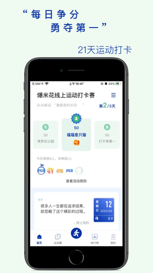 一键发起线上赛事,21天打卡激活精力;积分排名,奖品激励,从运动小白和同事一起成长为运动大神!