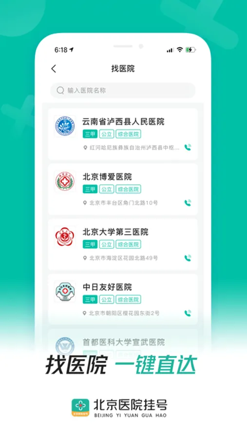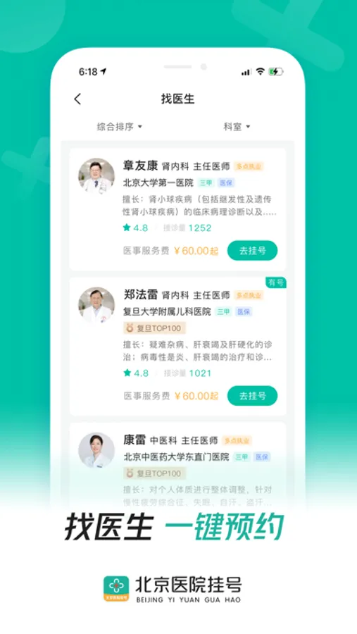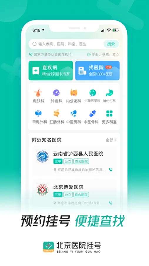 北京医院挂号,北京本地医院免费预约挂号平台,网上预约一键挂号。拥有多个科室5000+医生号源,平台合作医院有来自三甲医院的著名专家、主任、副主任医师等优质医生,覆盖多个科室。为到北京地区医院就诊的患者提供了更方便更快捷的就医选择。手机随时关注号源变化,真正避开号贩子,不收取任何费用,严选推荐优质专家医生,随时随地轻松挂号。充分体现互联网+医疗的便捷高效优势。